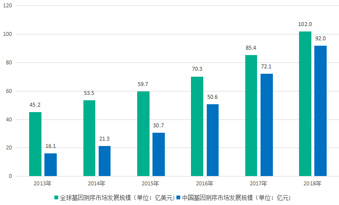 圖:2013-2018年全球及中國基因測序市場發展規模