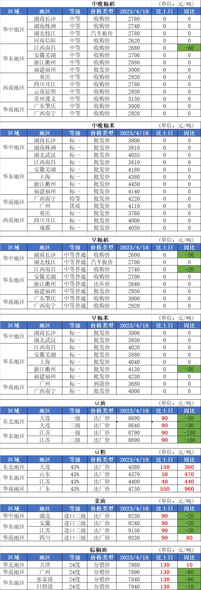 3、4月18日投放政策性稻谷90.11萬噸,實際成交6.29萬噸,成交率6.98%。其中早秈稻成交0.31萬噸,均價2491元/噸;中晚秈稻成交5.78萬噸,均價2513元/噸;粳稻成交0.2萬噸,均價2592元/噸。