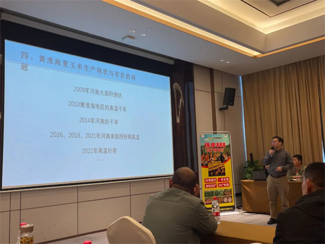 河南農業大學張戰輝老師以《豫單888育種策略與品種選育歷程》為題,做精彩報告。自然災害頻發、主要病蟲害頻繁發生、土地規模化經營面積逐步擴大、全程機械化程度逐年提高、播種密度逐年增加、種質遺傳基礎狹窄,品種潛在風險大等黃淮海夏玉米生產現狀與存在的問題進行詳細分析。