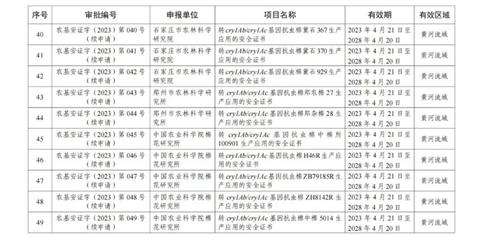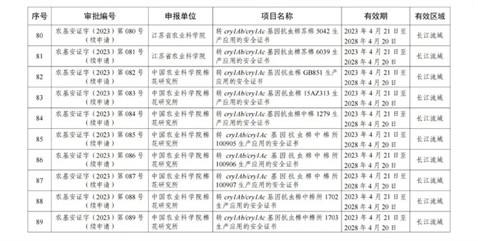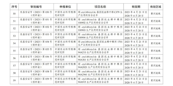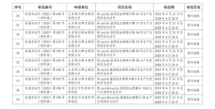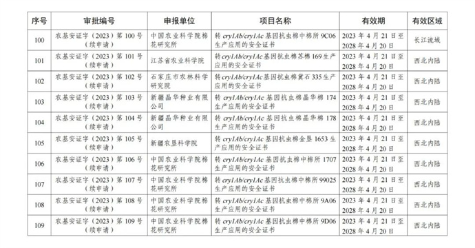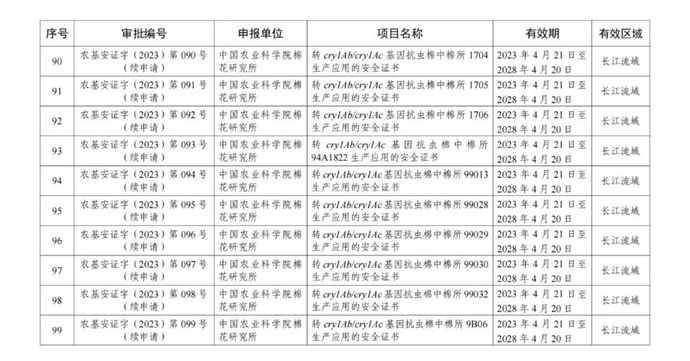 生物安全證書批準清單》,批準了113個農業轉基因生物安全證書(生產應用)以及1個農業用基因編輯生物安全證書(生產應用)。