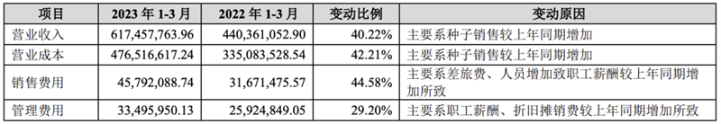 報告期(qi)內,公(gong)司實(shi)現營業收入(ru)61745.78萬元,較(jiao)上年(nian)(nian)同期(qi)增長 40.22%;凈(jing)利潤(run) 3,758.85萬元,較(jiao)上年(nian)(nian)同期(qi)增長 25.88%;歸屬于上市公(gong)司股東的(de)凈(jing)利潤(run) 3,131.71萬元,較(jiao)上年(nian)(nian)同期(qi)增長 53.40%。披(pi)露報告顯示,營業收入(ru)增長,主要(yao)是(shi)因(yin)為種(zhong)子銷售較(jiao)上年(nian)(nian)同期(qi)增加(jia)。
