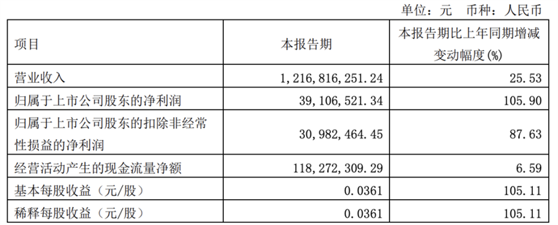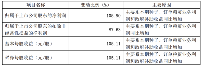 農(nong)發種業(ye)(ye)公(gong)告,一季度(du)實(shi)(shi)(shi)現(xian)(xian)營(ying)業(ye)(ye)收入12.17億元(yuan),同(tong)比(bi)(bi)增(zeng)長25.53%;實(shi)(shi)(shi)現(xian)(xian)凈利潤3910.65萬元(yuan),同(tong)比(bi)(bi)增(zeng)長105.9%。凈利同(tong)比(bi)(bi)實(shi)(shi)(shi)現(xian)(xian)較大增(zeng)長,主要(yao)系(xi)本(ben)期種子、訂單糧(liang)貿業(ye)(ye)務利潤和政(zheng)府(fu)補(bu)助收益(yi)同(tong)比(bi)(bi)增(zeng)加。