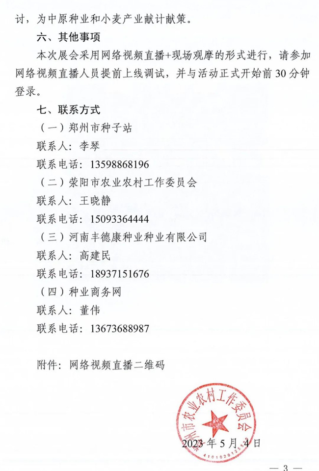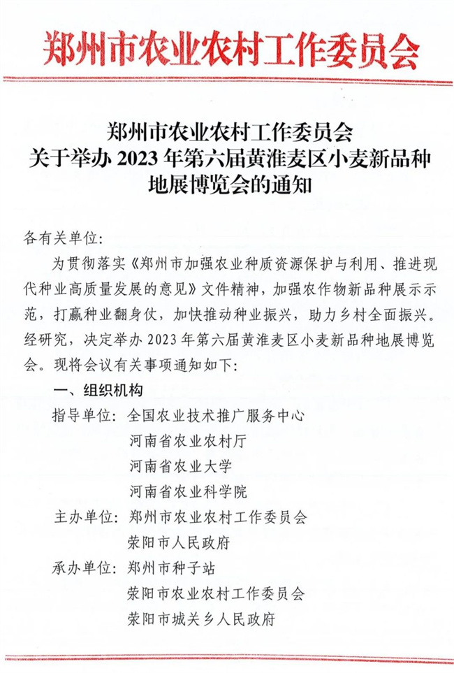 為貫徹落實《鄭州市加強農業種質資源保護與利用、推進現代種業高質量發展的意見》文件精神,加強農作物新品種展示示范,打贏種業翻身仗,加快推動種業振興,助力鄉村全面振興。經研究,決定舉辦2023年第六屆黃淮麥區小麥新品種地展博覽會。現將會議有關事項通知如下: