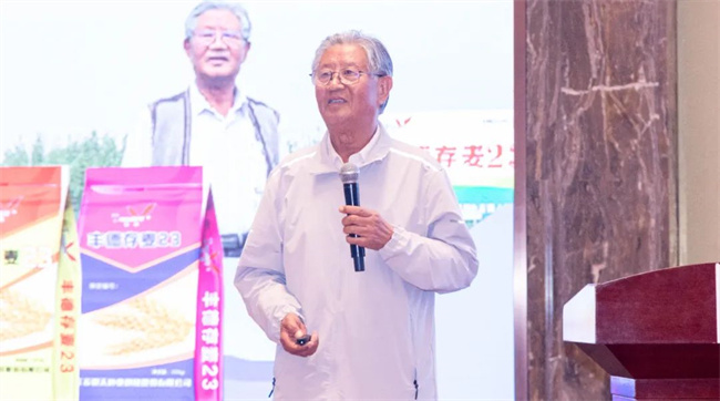 我國著名的小麥育種家鄭天存研究員以《豐德存麥23的選育及應用》為題做精彩報告。據介紹,豐德存麥23親本來源周27/周22,具有大穗大粒兼多穗的優勢組合。抗倒能力強,莖稈粗壯、彈性好,稈硬壁厚,基部節間短;接種鑒定:中抗條銹病、葉銹病和紋枯病,適應性強,根系活力強,抗后期干熱風,適應性好;三要素協調,增產潛力大,豐年大增產,災年也保產。