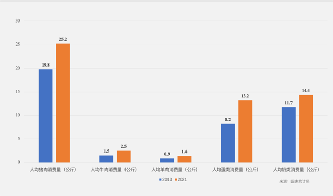 2021年(nian)居(ju)民家(jia)庭豬肉(rou)消(xiao)(xiao)(xiao)(xiao)費量(liang)(liang)25.2公(gong)(gong)斤(jin)(jin),人(ren)(ren)均(jun)(jun)牛肉(rou)消(xiao)(xiao)(xiao)(xiao)費量(liang)(liang)2.5公(gong)(gong)斤(jin)(jin),羊(yang)肉(rou)消(xiao)(xiao)(xiao)(xiao)費量(liang)(liang)1.4公(gong)(gong)斤(jin)(jin),蛋類(lei)(lei)(lei)消(xiao)(xiao)(xiao)(xiao)費量(liang)(liang)13.2公(gong)(gong)斤(jin)(jin),居(ju)民人(ren)(ren)均(jun)(jun)奶(nai)類(lei)(lei)(lei)消(xiao)(xiao)(xiao)(xiao)費14.4公(gong)(gong)斤(jin)(jin),其中農村(cun),城(cheng)鎮家(jia)庭消(xiao)(xiao)(xiao)(xiao)費量(liang)(liang)分(fen)別9.3公(gong)(gong)斤(jin)(jin),18.2公(gong)(gong)斤(jin)(jin)。由此(ci)可見(jian)城(cheng)鎮與(yu)農村(cun)的人(ren)(ren)均(jun)(jun)奶(nai)類(lei)(lei)(lei)消(xiao)(xiao)(xiao)(xiao)費量(liang)(liang)差距非(fei)常大。根據《中國統計年(nian)鑒2022》,北京是人(ren)(ren)均(jun)(jun)奶(nai)類(lei)(lei)(lei)消(xiao)(xiao)(xiao)(xiao)費量(liang)(liang)最高的城(cheng)市,2021年(nian)人(ren)(ren)均(jun)(jun)消(xiao)(xiao)(xiao)(xiao)耗(hao)31.8kg奶(nai)類(lei)(lei)(lei)食品,若簡單地以250g/盒的牛奶(nai)來計算,相當于人(ren)(ren)均(jun)(jun)一(yi)年(nian)喝了(le)127盒牛奶(nai)。