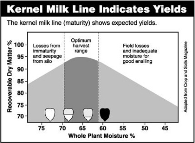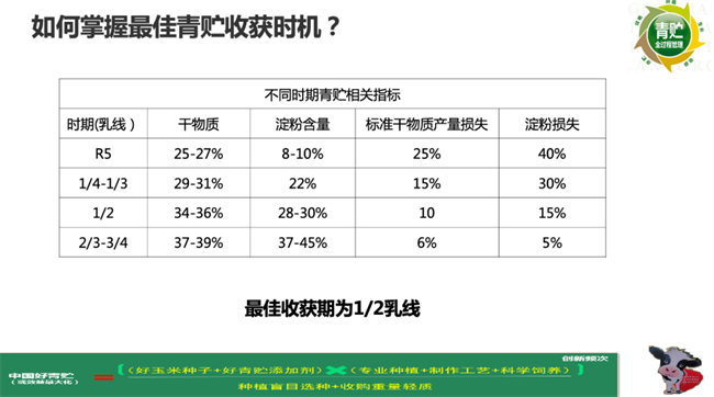 最佳時(shi)間是谷物(wu)的(de)乳線(xian)位于谷物(wu)頂部的(de) 1/3 和(he) 2/3 之間,因此最佳收(shou)獲(huo)(huo)期(qi)為1/2乳線(xian),DM 含量低(di)于 30% 會(hui)增(zeng)加細菌和(he)真菌腐敗的(de)風險(xian),收(shou)獲(huo)(huo)太晚會(hui)導致青(qing)貯(zhu)飼料(liao)(liao)的(de)營(ying)養(yang)價值低(di),因為淀粉和(he)纖維的(de)消化率低(di)。這種青(qing)貯(zhu)飼料(liao)(liao)也可能適口性(xing)差。