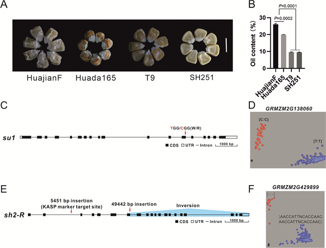 高油玉米籽粒含油率高達25%以上(較llinois高油玉米含量率高5個百分點,是由廣西大學、廣西益寶油料玉米開發有限公司和南寧桂福園農業有限公司共同選育的高油玉米雜交種華健1號選育而來),解析其形成的遺傳分子機理對下一步高油玉米育種和遺傳改良具有積極促進意義。首先利用B73×高油玉米的F2:3分離群體、BSR-seq及基因等位性測驗技術進行分析,發現su1和sh2-R分別提高玉米籽粒含油率4.20個百分點和7.66個百分點。序列分析發現su1基因突變體在第13外顯子第145個核苷酸處發生T-C(Trp-Arg)突變,而sh2-R基因突變體在第二內含子中有5451 bp的插入、在第七外顯子第121個核苷酸之后有49442 bp的插入變異,且從第七外外顯子的第121個堿基到第20外顯子間發生倒位突變。根據這兩個基因的關鍵突變位點開發了基因功能性KASP標記,能夠成功區分183份玉米材料中su1su1Sh2Sh2、Su1Su1sh2sh2和su1su1sh2sh2不同突變類型。