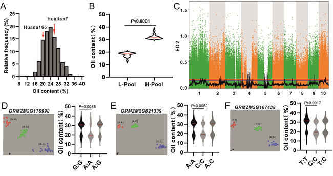 利用含油率相差6.14個百分點的兩個高油玉米構建的F2:3分離群體和BSA-seq定位技術鑒定到另外88個與玉米籽粒油含量相關的QTL,其中16個與先前報道的玉米油相關QTL重疊。RNA-seq分析發現兩個高油型甜玉米與兩個非高油型甜玉米間的差異表達基因顯著性富集于亞油酸代謝,氰基氨基酸代謝,谷胱甘肽代謝,丙氨酸、天冬氨酸和谷氨酸代謝以及氮代謝途徑。基于以上分析結果篩選BSA-seq定位區間內的高油候選基因。進一步分析發現候選基因GRMZM2G176998(WD40類β-螺旋重復蛋白)、GRMZG2G021339(homeobox轉錄因子)和 GRMZM2G167438(3-酮酰基-CoA合成酶)的KASP標記與分離群體中單株的籽粒含油量顯著相關;候選基因GRMZM2G099802(GDSL家族酯酶/脂肪酶)催化三酰甘油合成的最后一步,在兩個高油型甜玉米中的表達水平顯著高于兩個非高油型甜玉米(T9和SH251)。