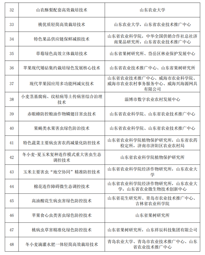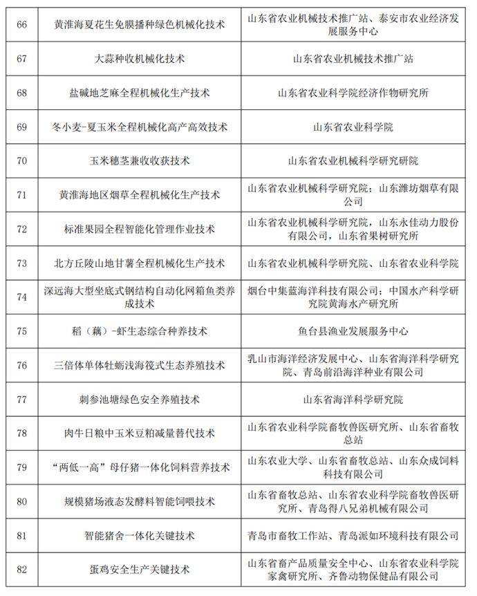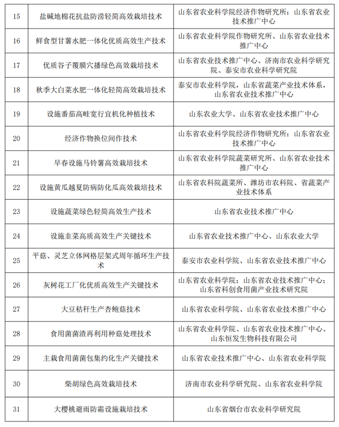 主要糧油作物主推品種包括“濟麥22”等12個小麥品種,“登海605”等9個玉米品種,“齊黃34”等5個大豆品種,“山花9號”等7個花生品種;農業主推技術包括“冬小麥勻苗壯株抗逆高產栽培技術”等8項小麥、玉米技術,“大豆一三三高產栽培技術”等2項大豆技術,“丘陵旱薄地花生高產穩產綜合配套技術”等3項花生技術,“鮮食型甘薯水肥一體化優質高效生產技術”等2項雜糧技術,以及多項棉花、蔬菜、食用菌、中藥材、水產養殖、畜牧養殖業技術等。