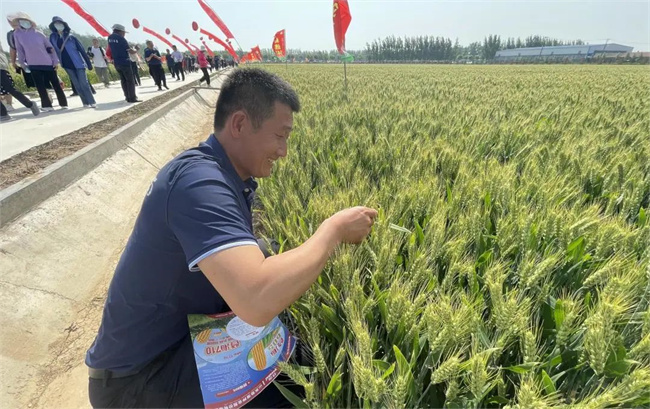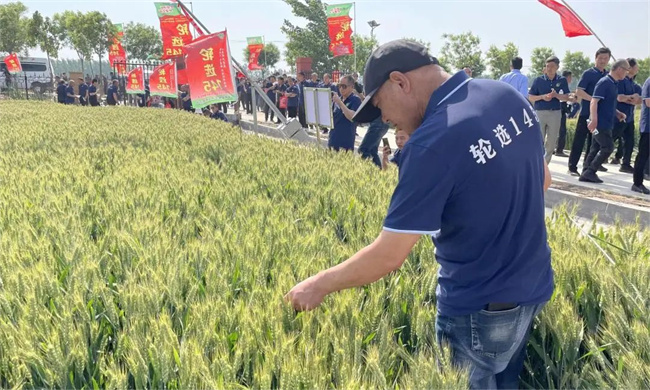 會議期間,參會嘉賓觀摩了輪選145展示地塊,聽取了技術人員對播期、播量及田間管理技術措施介紹,認真查看了輪選145目前籽粒灌漿情況,丈量了株高和估測了大田群體。均表示,對輪選145株高低,莖稈粗壯,莖基部節間短而且硬實,抗倒強;群體大,產量三要素協調,增產潛力大。而且到目前為止,輪選145田間無任何死穗、白穗等綜合性狀優勢感到非常滿意。