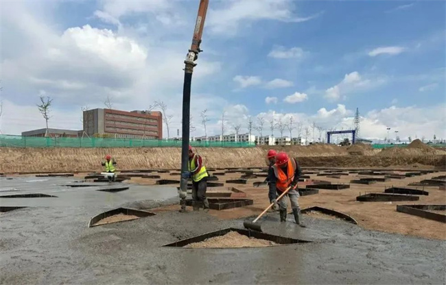 在伊寧縣制種玉米果穗烘干研發中心建設項目的現場,工人們正在進行倉儲墊層作業,泵車、攪拌車及工人們的相互協作配合,現場工作井然有序鋪開。