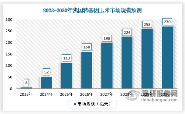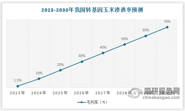 2023年,中國轉基因玉米由大田試驗轉為部分區域試銷,參考美國轉基因玉米推廣經驗,2023年中國轉基因玉米滲透率約為1.5%,預計未來2024-2026年,滲透率分別為10%、20%、30%。預計到2030年,轉基因玉米種子滲透率達到70%,市場規模達到270億元。