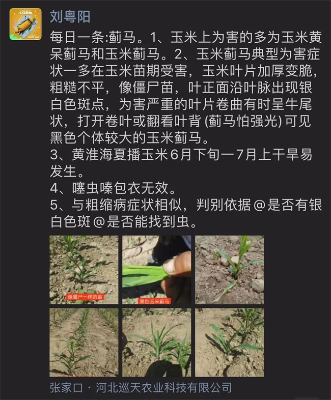 每年6月底至7月初,每當夏播玉米長到(dao)3片葉(xie)(xie)(xie)(xie)以上(shang)(shang)時(shi),往往會(hui)出現(xian)心(xin)(xin)葉(xie)(xie)(xie)(xie)發(fa)黃、扭(niu)曲,好(hao)像是(shi)除草劑藥(yao)害(hai),有(you)(you)時(shi)候剛展開的(de)(de)心(xin)(xin)葉(xie)(xie)(xie)(xie)上(shang)(shang)有(you)(you)不規則的(de)(de)黃白色透明斑,嚴重時(shi)玉米植株矮化不長,這又像粗縮病的(de)(de)癥狀(zhuang)(zhuang),大(da)喇叭(ba)口期(qi)前(qian)后遇雨會(hui)導(dao)致心(xin)(xin)葉(xie)(xie)(xie)(xie)基部腐爛,形成疑似頂腐病的(de)(de)癥狀(zhuang)(zhuang)。撥開葉(xie)(xie)(xie)(xie)片順著心(xin)(xin)葉(xie)(xie)(xie)(xie)往中(zhong)心(xin)(xin)仔(zi)細觀察,會(hui)有(you)(you)很(hen)小的(de)(de)黑褐(he)色或黃褐(he)色小蟲在爬來爬去,這就是(shi)薊馬。最(zui)近經常看到(dao)朋友圈和微信群尋醫(yi)問(wen)藥(yao),玉米葉(xie)(xie)(xie)(xie)片扭(niu)曲,呈牛尾巴狀(zhuang)(zhuang)。網絡上(shang)(shang)有(you)(you)很(hen)多相關的(de)(de)文章,但缺(que)少清晰(xi)的(de)(de)圖片,讓大(da)家沒有(you)(you)辦法按圖索驥。