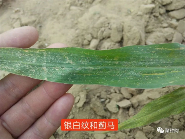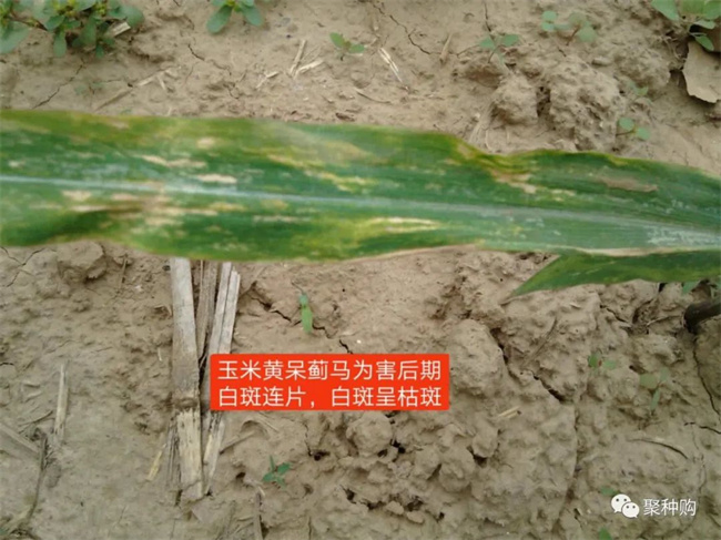 成蟲以銼吸式口器(qi)刮破(po)玉(yu)米葉(xie)片表(biao)皮,用口器(qi)插入組(zu)織吸取汁液(ye),被害葉(xie)背(bei)面出現斷續的銀白色條斑,葉(xie)正(zheng)面與此對應的部(bu)分(fen)呈黃色條斑,嚴(yan)重時葉(xie)背(bei)面如同涂一層銀粉,葉(xie)片畸形、破(po)裂、變(bian)黃干(gan)枯、死(si)亡。
