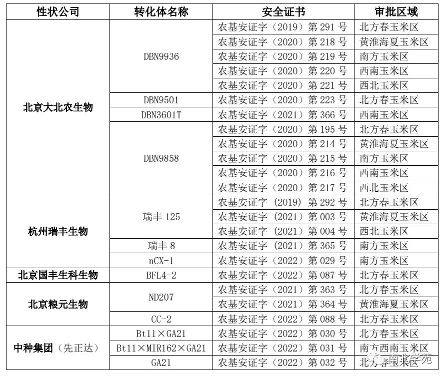 截止 2023 年 1 月,農業農村部發布《2022 年農業轉基因生物安全證書(生產應用)批準清單(二)》, 其中包括 2 個轉基因玉米項目。至此,我國已陸續頒布 13 張轉基因玉米安全證書。其中,北京大北農生物技術有限公司共擁有 4 個玉米轉基因生物安全證書;北京國豐生科生物科技有限公司,擁有 1個玉米轉基因生物安全證書;杭州瑞豐生物科技有限公司擁有 3 個玉米安全證書;中國種子集團(先正達)擁(yong)有 3 個玉(yu)米(mi)安全(quan)證書;北京糧元生物科技有限公司擁(yong)有 2 個玉(yu)米(mi)轉基因生物安全(quan)證書。詳情如下表(biao)所示: