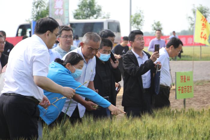 與會人員到濱州國興生態農業基地現場觀摩了濟麥44晚播千畝示范方,聽取了濟麥44推廣應用情況介紹。記者看到,示范方麥粒飽滿、豐收在望。該基地從2019年開始種植濟麥44,目前已發展6000余畝,相較其他優質麥品種可增產5%以上、銷售價格每斤多買0.1元。近年來,濱州依托基地建設和示范帶動,全市推廣濟麥44面積達60多萬畝,與會人員對此給以充分肯定。趙振東表示,濱州市為通過優質麥的規模化實現優質麥的產業化發揮了積極的推動作用。濟麥44是山東省農業科學院作物研究所雜交選育的綠色、強筋、高產小麥新品種,具有株型較緊湊、抗倒性較好、整齊度較好的特點,在面筋指數、吸水率、穩定性等多方面已接近并可替代進口小麥,2021年成為全國第一大強筋小麥品種。近年來,山東省通過積極推廣濟南17、煙農19、濟麥44等優質強筋小麥品種,有效增加了優質專用小麥供給,在一定程度上改善了我國優質強筋麥長期依賴進口的局面。