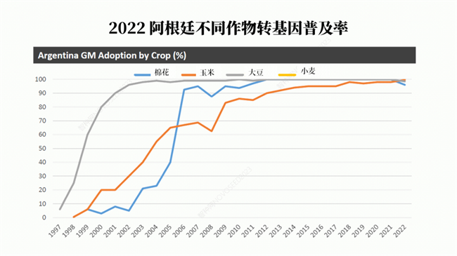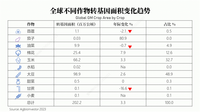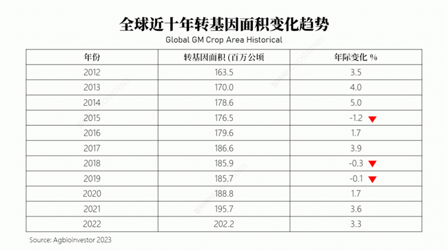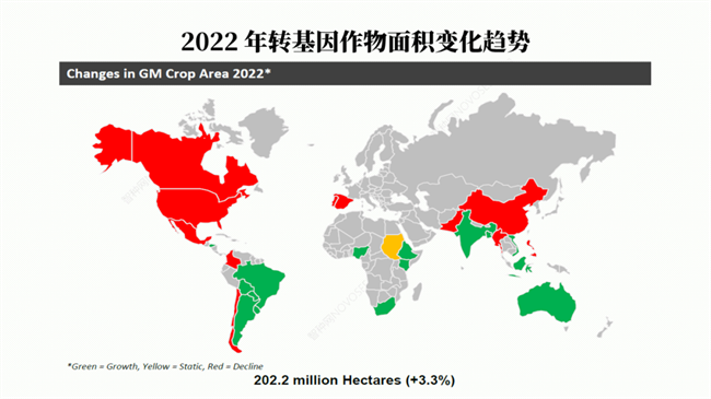 2022 年,全球轉基因作物種植面積比上一年增長了 3.3%,達到 2.022 億公頃,創下了新的紀錄。27 個國家種植了 11 種不同的轉基因作物,其中大豆種植面積最廣,達到 9890 萬公頃,其次是玉米,達到 6620 萬公頃。2022 年,菲律賓首次種植了轉基因水稻。