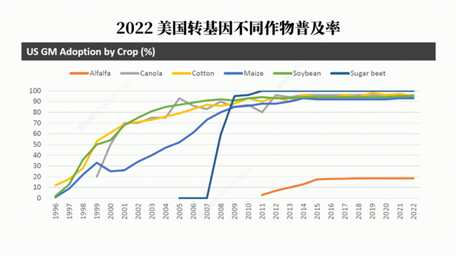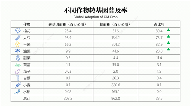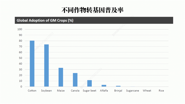 下表和條形圖顯示了各種作物的全球采用率。棉花的轉基因利用率是最高的,占全球棉花種植面積的80.4%,其次是大豆(73.7%),玉米(32.9%)和油菜(23.8%)。此后,全(quan)球采用(yong)率迅速下降。