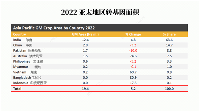 亞(ya)太地(di)區(qu)(qu)的(de)轉(zhuan)(zhuan)基因(yin)(yin)種植面(mian)積(ji)(ji)總(zong)量(liang)明顯小于美洲地(di)區(qu)(qu),在(zai)2022年僅為1940萬公頃。目(mu)前(qian),印度占該地(di)區(qu)(qu)轉(zhuan)(zhuan)基因(yin)(yin)種植面(mian)積(ji)(ji)的(de)大多數(shu)(63.6%)。在(zai)作物層面(mian)上,棉(mian)花是主導的(de)轉(zhuan)(zhuan)基因(yin)(yin)作物,占總(zong)轉(zhuan)(zhuan)基因(yin)(yin)面(mian)積(ji)(ji)的(de)91%以(yi)上。