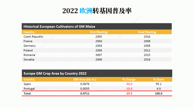 在區域層面上(shang),歐(ou)洲在2022年僅有71112公頃的(de)轉基(ji)(ji)因(yin)種植(zhi)(zhi)(zhi)面積(ji)(ji),是世界上(shang)最小的(de)。該地區大部(bu)分轉基(ji)(ji)因(yin)種植(zhi)(zhi)(zhi)面積(ji)(ji)位(wei)于西(xi)班牙(ya)(ya),西(xi)班牙(ya)(ya)種植(zhi)(zhi)(zhi)了(le)該地區95.1%的(de)轉基(ji)(ji)因(yin)玉(yu)米。歷(li)史上(shang),許多歐(ou)洲國(guo)家種植(zhi)(zhi)(zhi)過轉基(ji)(ji)因(yin)玉(yu)米,但現在只有西(xi)班牙(ya)(ya)和葡萄牙(ya)(ya)保留了(le)轉基(ji)(ji)因(yin)作物的(de)種植(zhi)(zhi)(zhi)。