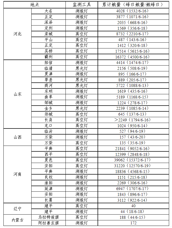 6月份以來,一代棉鈴蟲成蟲進入盛發期,黃淮、華北地區蛾量偏高,局部地區誘蛾量均高于2022、2021年同期累計蛾量,部分站點累計蛾量超過蛾量高發的2020年。河北、山東、河南、山西等地高空測報燈共有10個監測點累計蛾量超過1000頭,其中6個監測點超過10000頭;地面測報燈(黑光燈)共有17個監測點累計蛾量超過1000頭,其中8個監測點超3000頭;誘蛾高峰日集中在6月15—18日,峰日蛾量多在幾百頭至幾千頭,部分站點上萬頭(數據見下表)。此次黃淮華北地區多點同期集中出現蛾峰,且河南地面燈蛾量高而河北山東高空燈蛾量高,據初步軌跡分析,推測為自黃淮南部向華北地區和東北南部北向遷飛為主。當前遼寧西部地區田間已出現零星幼蟲,需警惕集中產卵后幼蟲暴發危害。