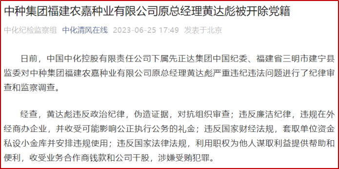 據中國中化集團反腐宣傳平臺6月25日消息,日前,中國中化控股有限責任公司下屬先正達集團中國紀委、福建省三明市建寧縣監委對中種集團福建農嘉種業有限公司原總經理黃達彪嚴重違紀違法問題進行了紀律審查和監察調查。