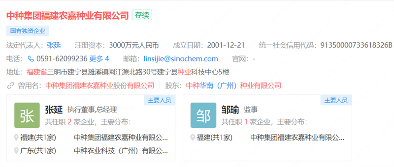 企查查顯示,中種集團福建農嘉種業有限公司成立于2001年,注冊資本為3000萬元人民幣,公司地址位于福建省建寧縣,公司股東為中種華南(廣州)種業有限公司。