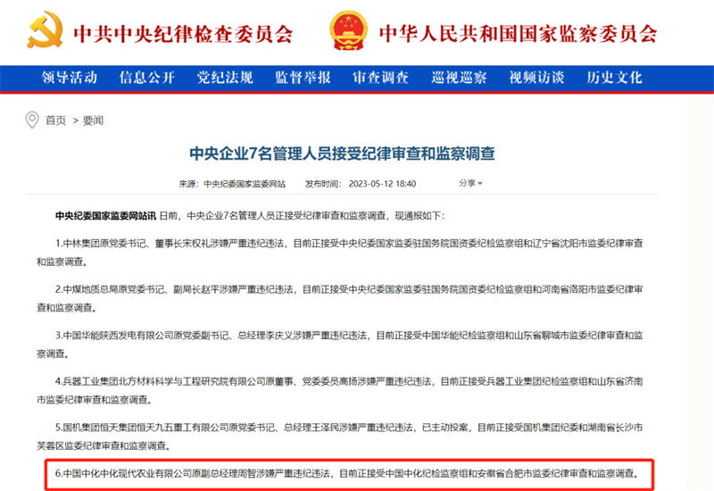 據中央紀委國家監委網站5月12日通報,中央企業7名管理人員正接受紀律審查和監察調查。其中,中國中化中化現代農業有限公司(下稱“中化現代農業”)原副總經理周智涉嫌嚴重違紀違法,目前正接受中國中化紀檢監察組和安徽省合肥市監委紀律審查和監察調查。