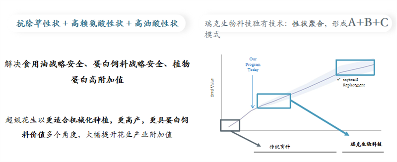 瑞克生物科技創始人駱超表示,目前團隊正在嘗試抗除草劑性狀+高賴氨酸性狀+高油酸性狀的基因編輯花生創制,該花生品種將更適合機械化種植、更高產、更具蛋白飼料價值,通過一次編輯實現多個性狀基因的同時編輯,大幅提升花生產業附加值。迎合花生大豆化的生產形勢。