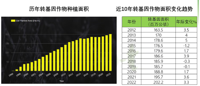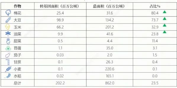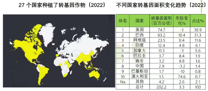 2022年,全球轉基因作物的種植面積達到歷史最高,為2.022億公頃,比上一年增長了3.3%。全球轉基因作物的種植面積也已占到耕地總面積的1/8,美國、巴西、阿根廷、印度和加拿大是全球轉基因作物種植面積排名前5的國家。
