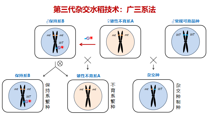 2019年在第三屆中國(三亞)國際水稻論壇上,袁隆平院士在報告指出:第三代雜交稻“初露鋒芒” ,克服了三系法雜交水稻配組難度大和兩系法雜交水稻育性不穩定的弱點,雙季晚稻單產15000千克/公頃,是今后的發展方向。而廣三系法也是運用了生物育種技術而發展起來的新技術。