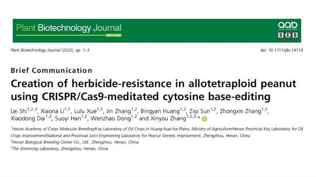 近日,河南省農業科學院/神農種業實驗室張新友院士團隊突破花生遺傳轉化技術瓶頸,利用CRISPR/Cas9單堿基編輯技術率先實現了對花生基因的單堿基替換,創制出抗苯磺隆除草劑的花生新種質,這也是國際上首次關于利用該技術創制花生新種質的報道,為花生種質資源精準創新提供了新的途徑。該項研究成果以(《植物生物技術》,中科院一區TOP期刊,影響因子13.8)上發表。