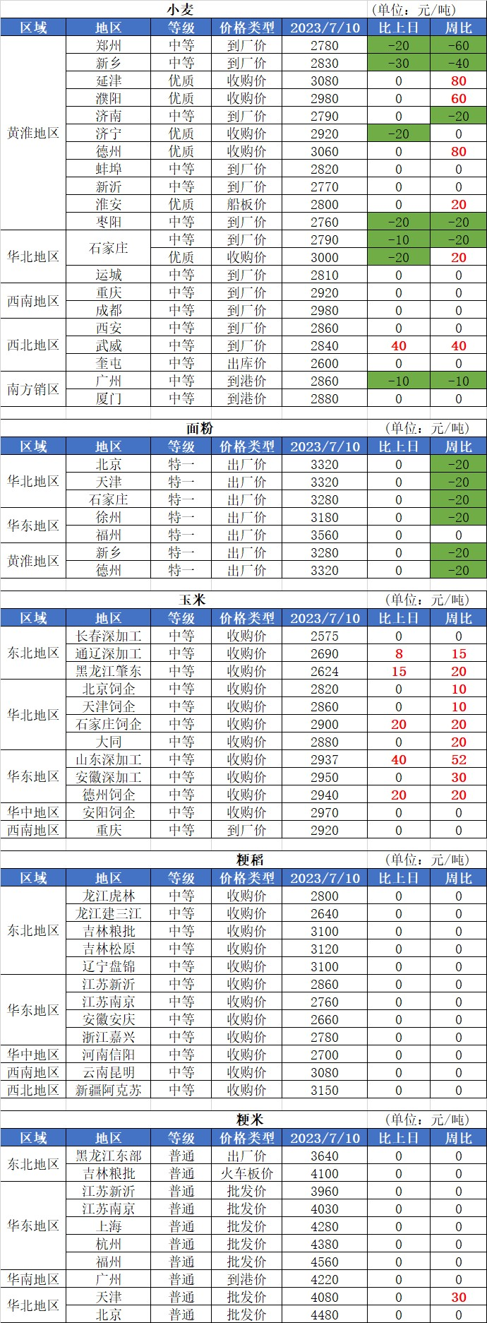 1、7月10日小麥價格繼續小幅下跌,跌幅0.5-1.0分/斤,主產區制粉企業收購價格范圍在1.36-1.47元/斤。