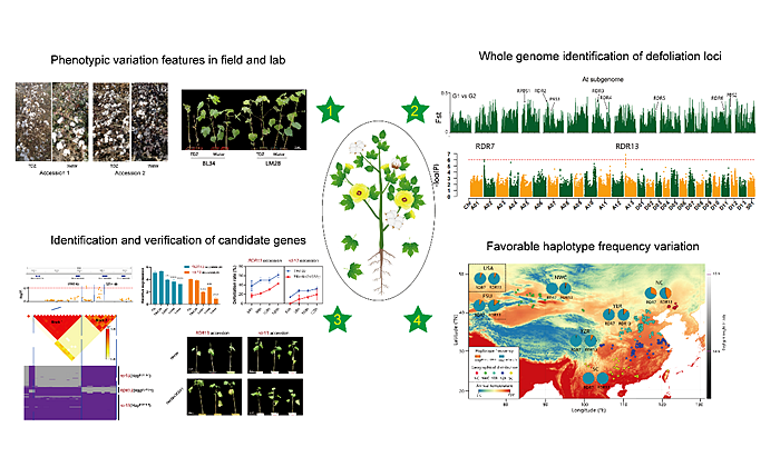 近日,中國農業科學院棉花研究所棉花資源創新利用創新團隊和棉花綠色增產增效創新團隊合作揭示了棉花葉片脫落的表型變異規律及其遺傳機制,對提高棉花脫葉效率和培育機采棉品種具有指導意義。相關研究結果發表在《尖端研究雜志(Journal of Advanced Research)》上。