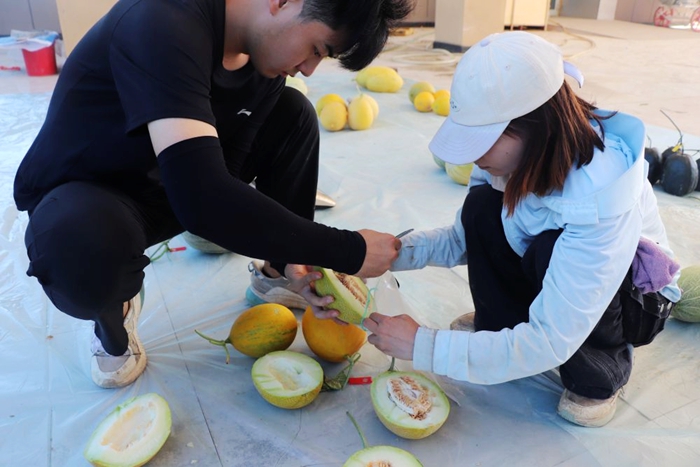 7月14日,工作人員在進行甜瓜果肉糖度數據采集。新華社記者 尚升 攝