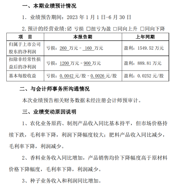 7月15日,豐樂種業公布2023年半年度業績預報,根據公告顯示,公司上半年種子業務收入和利潤同比增加,不過農化和肥料業務拖累業績,導致整體略虧。