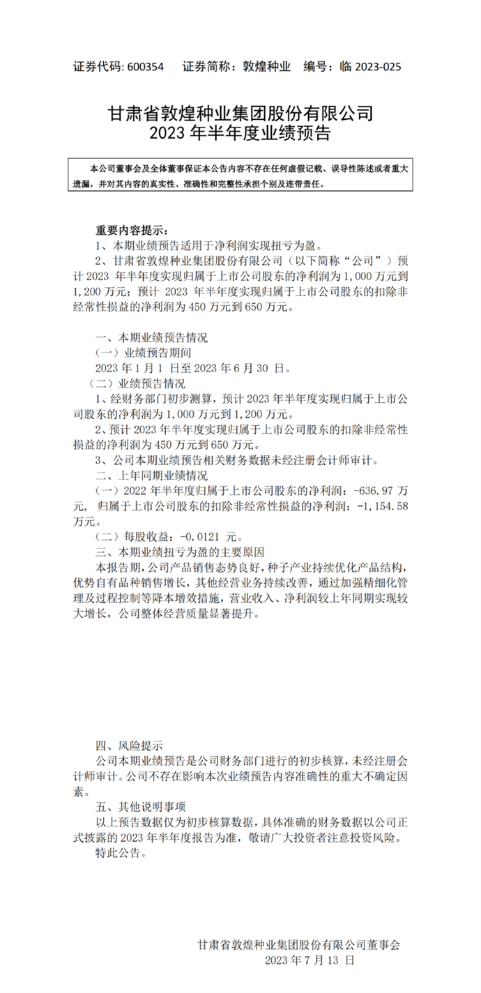 敦煌種業7月12日發布2023年半年度業績預告,預計2023年半年度實現歸屬于上市公司股東的凈利潤為1000萬元到1200萬元,同比扭虧為盈。預計 2023 年半年度實現歸屬于上市公司股東的扣除非經常性損益的凈利潤為 450 萬元到 650 萬元。報告期內,公司產品銷售態勢良好,種子產業持續優化產品結構,優勢自有品種銷售增長,其他經營業務持續改善。