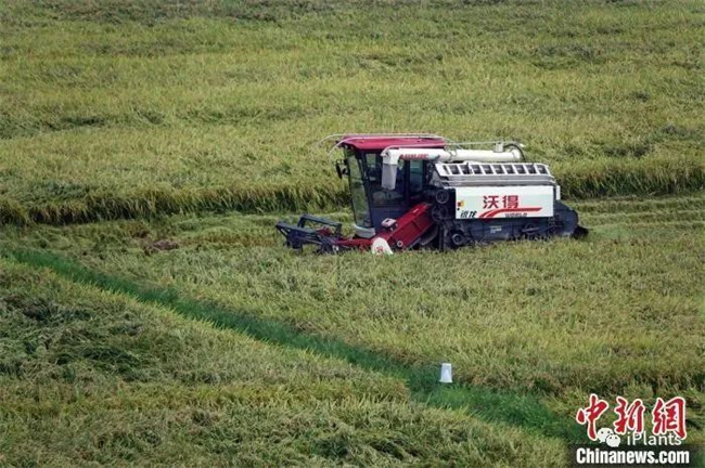 “中科發早粳(jing)1號”等(deng)新品系江西上(shang)高千畝(mu)示范現場(chang),大型收割(ge)機在開展水稻收割(ge)作業。中新社(she)記者(zhe) 孫自法 攝(she)