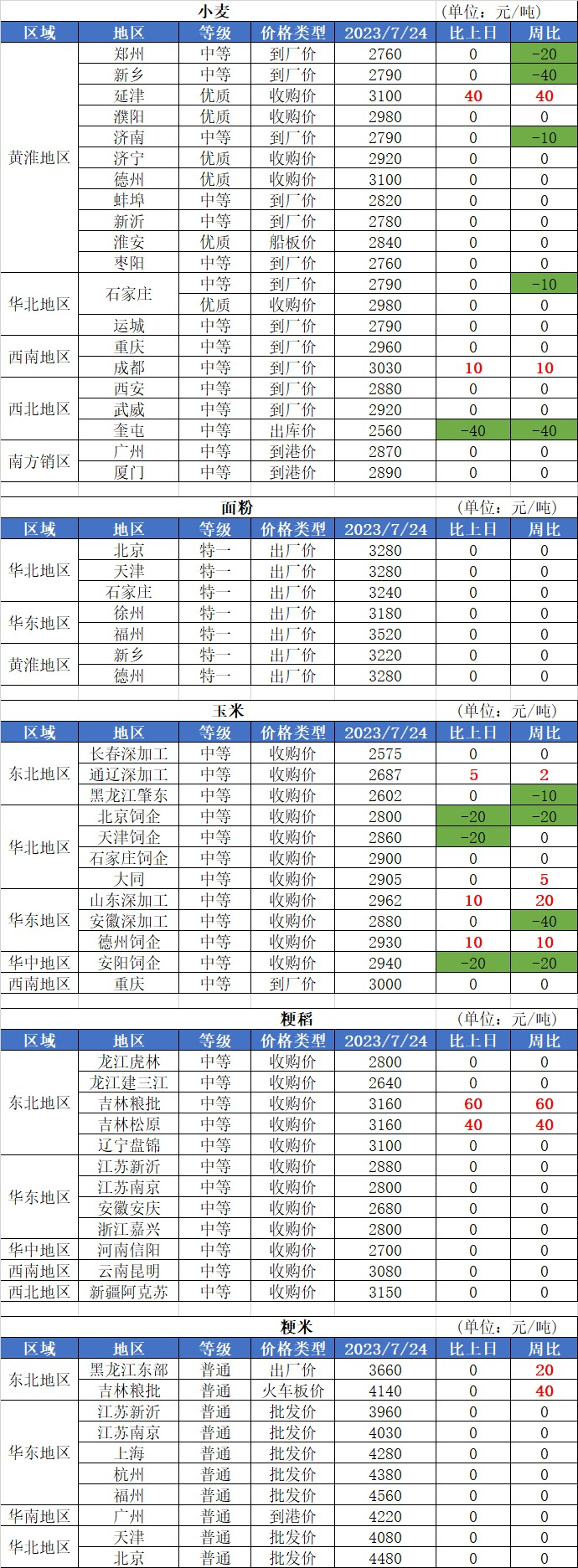 2、7月24日國內玉米價格偏弱震蕩,其中:南北港口、東北地區、南方銷區玉米價格基本穩定;山東地區玉米價格基本穩定,局部價格明顯震蕩,震蕩幅度4-70元/噸;華北地區玉米價格基本穩定,局部價格上漲,漲幅10元/噸。