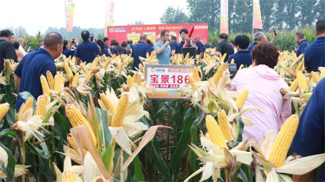 會議期間,參會代表觀摩了寶景186大田種植表現。一株株被剝開了苞葉,削去了果穗以上部分的寶景186玉米新品種,傲人挺立。滿眼排列整齊的果穗,像列隊的戰士等待著眾人的“檢閱”。每顆果穗都是棒大籽深,高低一致,一粒封頂,引來觀摩人群的陣陣圍觀,拍照留念、發短視頻、分享朋友圈絡繹不絕,猶如自帶流量的“網紅”,吸引了眾多觀摩代表的目光。