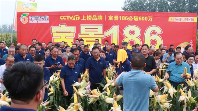 “寶景186紅軸、大穗,軸細粒深,抗病耐旱,產量高,適應性好。”觀摩代表對寶景186的喜愛之情溢于言表。據了解,寶景186株高矮,穗位低,還有耐高溫、結實性好、綜合抗性強,容重高,深受廣大種植戶喜愛,經銷商的認可。寶景農業寶景事業部負責人石亞飛介紹,寶景186幼苗葉鞘紫色,葉片深綠色,苗齊苗壯,根系發達,抗倒性好;株高240CM,免化控,減少種植成本;籽粒金黃,容重高,品質優,宜機收 ;田間綜合性狀優勢明顯。自上市以來,年銷售量近400萬袋,已覆蓋湖北、安徽、江蘇、山東、河北、河南等省份。目前,東華北地區開始進入生產試驗。