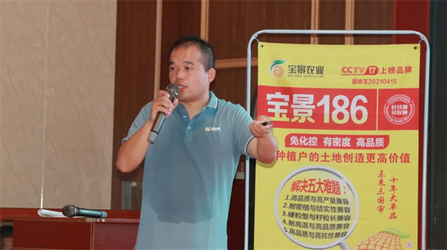 感謝選擇,協力合作。室內交流會上,河南寶景農業科技有限公司總經理高宏偉介紹,寶景186自上市以來,經受住了多重惡劣氣候考驗,其優異表現相信各位合作伙伴有目共睹。今年,不僅遇到了春季的低溫天氣,授粉期間又遭遇高溫熱害,但是,我們可以看到寶景186依然一粒封頂,年年表現優秀如一。