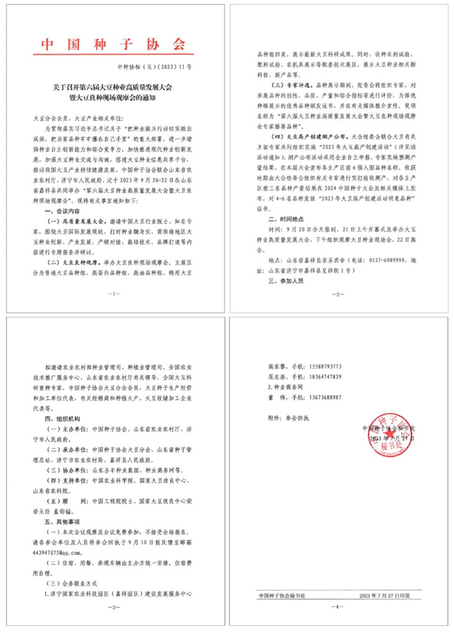 為貫徹落實習近平總書記關于“把種業振興行動切實抓出成效,把當家品種牢牢攥在自己手里”的重大部署,進一步增強種業自主創新能力和綜合競爭力,加快推進現代種業創新發展,加強大豆種業交流與溝通,搭建大豆種業信息共享平臺, 推動我國大豆產業持續健康發展,中國種子協會聯合山東省農 業農村廳、濟寧市人民政府,定于2023年9月20-22日在山東省嘉祥縣共同舉辦“第六屆大豆種業高質量發展大會暨大豆良種現場觀摩會”。現將有關事宜通知如下: