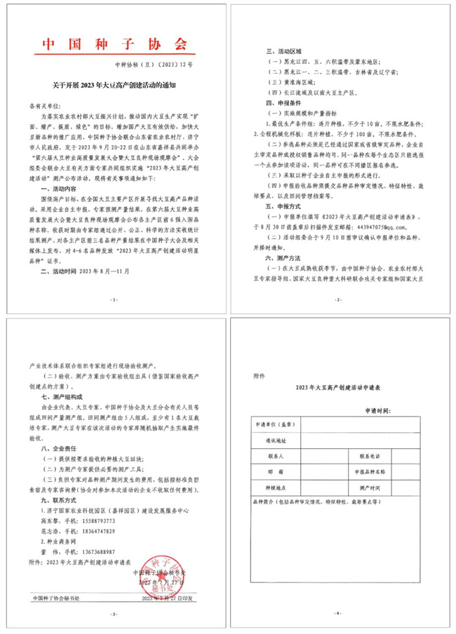 為落實農業農村部大豆振興計劃,推動國內大豆生產實現“擴面、增產、提質、綠色”的目標,增加國產大豆有效供給,加快大豆新品種的推廣應用,中國種子協會聯合山東省農業農村廳、濟寧市人民政府,定于2023年9月20-22日在山東省嘉祥縣共同舉辦 “第六屆大豆種業高質量發展大會暨大豆良種現場觀摩會”。大會組委會聯合大豆有關方面專家共同組織實施“2023年大豆高產創建活動”測產公布活動。現將有關事項通知如下: