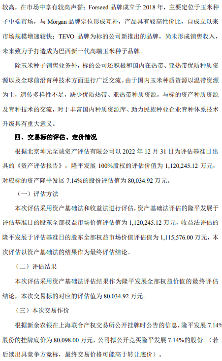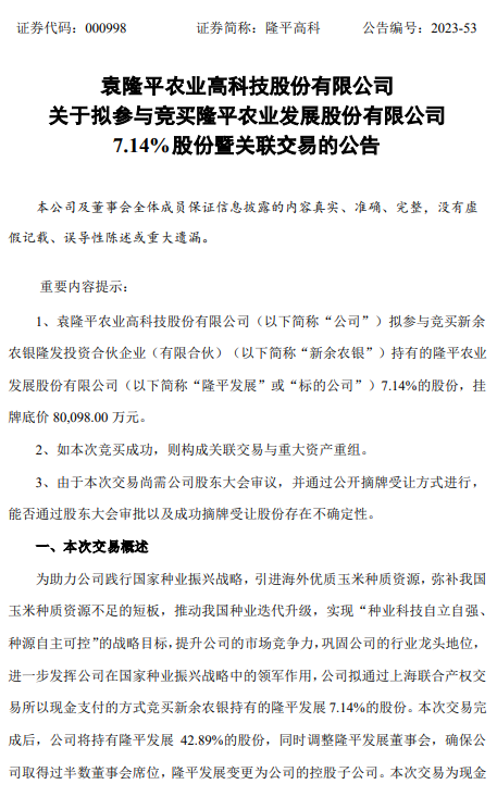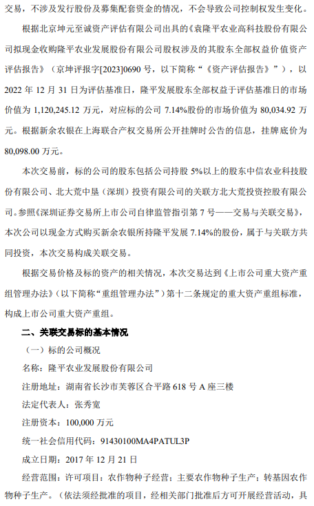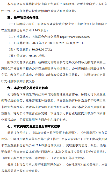 7月31日早間,隆平高科公告,公司正籌劃以現金方式購買新余農銀隆發投資合伙企業持有的隆平農業發展股份有限公司7.14%股份。新余農銀通過上海聯合產權交易所發布信息公告,公開掛牌轉讓所持隆平發展7.14%股份,掛牌底價為80098萬元。