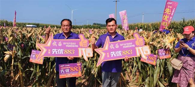 先優種業業務經理張成功和區域經理陳寶中分別從不同角度對先優883在各地優秀表現做分享。通過各地種植戶反饋信息來看,先優883具有以下優勢:株高穗位比例協調,氣生根發達,扎根深,節間短,莖稈粗壯韌性好,抗倒能力強;抗病性好,抗南方銹病、中抗紋枯病、中抗莖腐病、抗穗腐病;籽粒飽滿,結實性好,一粒封頂;高產優質,色澤金黃,容重高,棒子大,出籽率高。