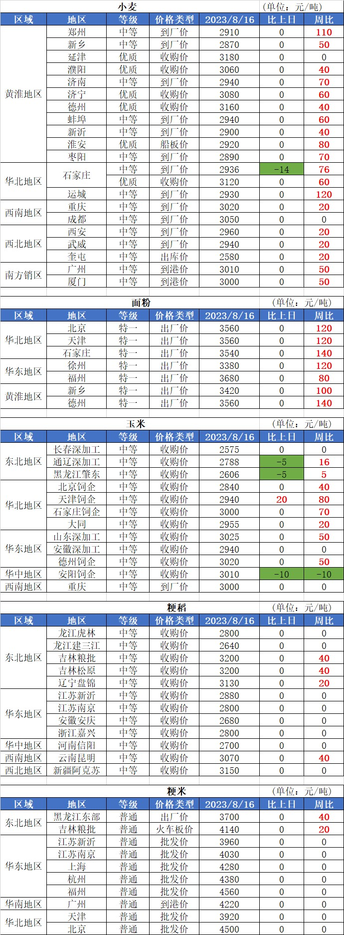 2、8月16日國內玉米價格偏弱調整,其中:南北港口、華北地區、東北地區、南方銷區玉米價格基本穩定;山東地區玉米價格基本穩定,局部價格下跌,跌幅4-26元/噸。