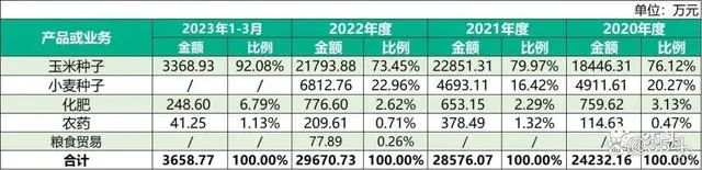 該(gai)公司業務集中于玉(yu)米和(he)小麥種子。招(zhao)股書顯示,玉(yu)米和(he)小麥種子業務近(jin)三年(nian)及2023年(nian)第一(yi)季度(du)的營(ying)收占比分別達到96.39%、96.39%、96.41%、92.08%。