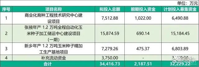 7月24日(ri),金(jin)苑種業的(de)申報材料正(zheng)式獲(huo)得北交所受理,由民生證券(quan)保薦沖(chong)刺上市。招股(gu)(gu)書顯示,金(jin)苑種業本次擬向不特定合格投資(zi)者公開發(fa)行最多(duo)3914.6萬股(gu)(gu)A股(gu)(gu)股(gu)(gu)票,發(fa)行底(di)價(jia)10.96元/股(gu)(gu),擬募集資(zi)金(jin)3.356億(yi)元,主要(yao)用于四(si)大項(xiang)(xiang)目,具(ju)體包括(kuo)新(xin)鄉年產(chan)(chan)1.2萬噸(dun)玉(yu)米種子精加(jia)工生產(chan)(chan)基地項(xiang)(xiang)目、張(zhang)掖年產(chan)(chan)1.2萬噸(dun)全程自動(dong)化玉(yu)米種子加(jia)工儲運中心建設(she)項(xiang)(xiang)目、商(shang)業化育種工程技術(shu)研究中心建設(she)項(xiang)(xiang)目,以(yi)及補(bu)充流動(dong)資(zi)金(jin)。