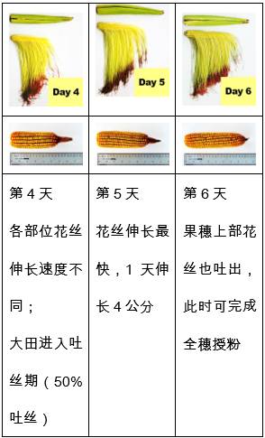 果穗吐絲后的第5天,花絲伸長速度最快時,1天內可伸長4公分;
